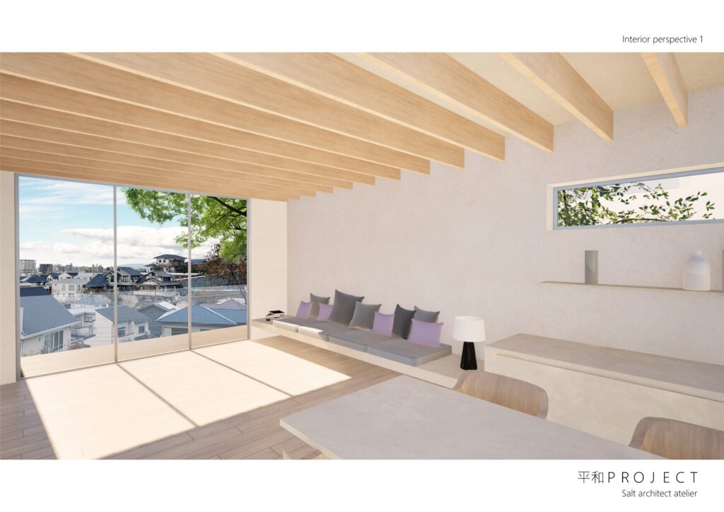 建物は、視線の抜けるLDKを南側に配置し、リビング・バルコニーからは高台ならではの市街地と空を眺める眺望を、
