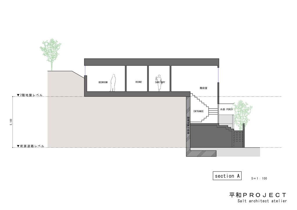 そこで、設計地盤レベルを道路面から5mの高さに設定し、前面道路側のみ擁壁を作り、残り3方は擁壁工事が不要になる計画としています。